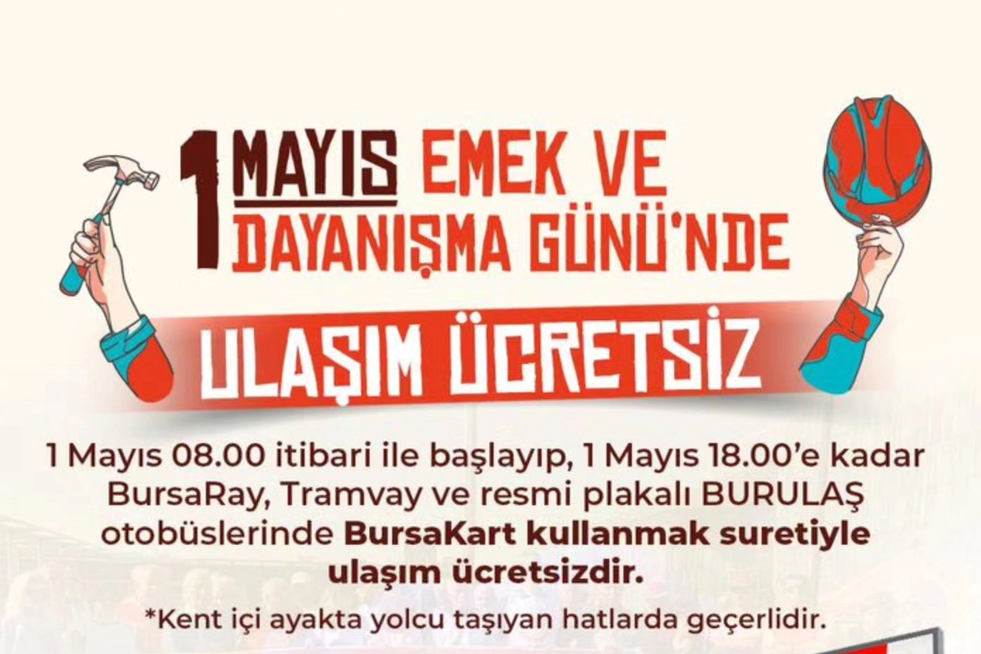Bursa Büyükşehir Belediye Başkanı Mustafa Bozbey, tüm emekçilerin 1 Mayıs İşçi Bayramı’nı kutladı. Bursa Büyükşehir Belediyesi olarak emeğin ve emekçinin yanında olmaya devam edeceklerini söyleyen Başkan Mustafa Bozbey, “1 Mayıs Emek ve Dayanışma Günü’nde kutlama ve etkinliklerin coşkulu kalabalıklarla yapılabilmesi amacıyla BursaRay ve tramvay hatları ile resmi plakalı Burulaş otobüsleri, 1 Mayıs 2025 Perşembe günü 08.00 ile 18.00 saatleri arasında BursaKart kullanmak suretiyle ücretsiz olarak hizmet verecektir” dedi.