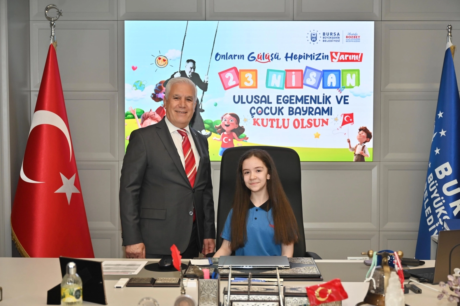 Bursa Büyükşehir Belediye Başkanı Mustafa Bozbey, 23 Nisan Ulusal Egemenlik ve Çocuk Bayramı dolayısıyla koltuğunu temsili olarak 7. sınıf öğrencileri Duru Tuna ve İlke Ormancı’ya devretti.