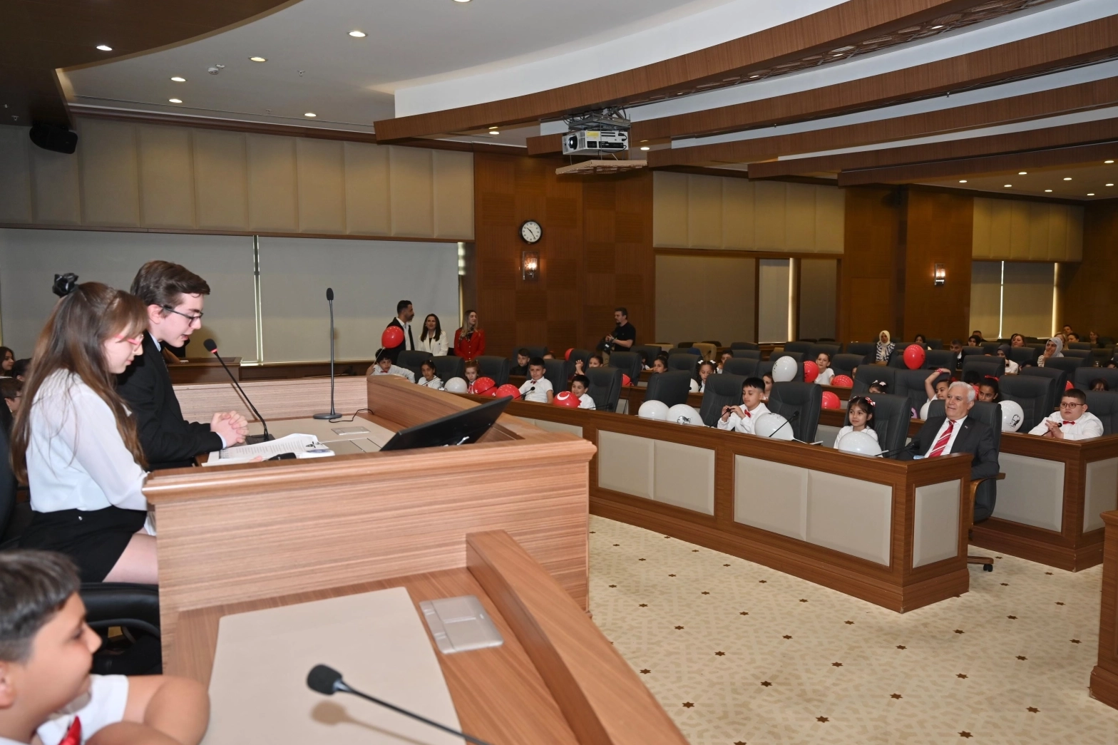 BURSA (İGFA) - 23 Nisan Ulusal Egemenlik ve Çocuk Bayramı ile TBMM’nin açılışının yıl dönümü kutlamaları kapsamında ‘Bursa Büyükşehir Belediye Meclisi Çocuk Oturumu’ Başkan Bozbey’in katılımıyla gerçekleşti. Bursa Büyükşehir Belediye Başkanı Mustafa Bozbey’in koltuğuna oturan Bursa Kent Konseyi Çocuk Meclisi Başkanı Yağız Vatansever ve Çocuk Meclisi yürütme kurulu üyesi İnci Bade Yiğit, çocuklar adına oturum başlangıç konuşmasını gerçekleştirdi.