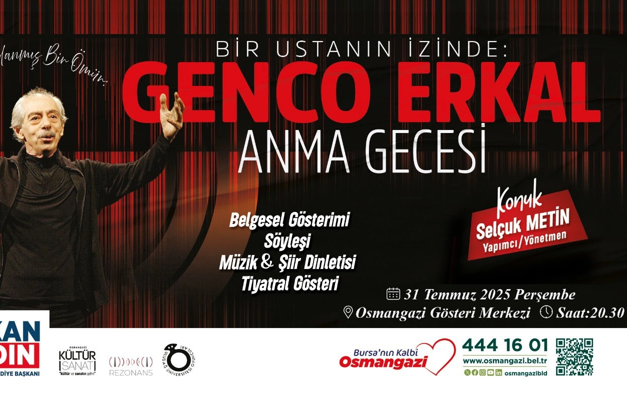 Osmangazi Belediyesi, 2024'te yaşamını yitiren Türk tiyatrosunun duayen ismi Genco Erkal'ı, ölümünün birinci yıl dönümünde düzenlenecek özel bir etkinlikle yad edecek. 31 Temmuz 2025'te Perşembe akşamı saat 20.30'da Osmangazi Gösteri Merkezi'nde yapılacak olan bu etkinlikte, usta sanatçının tiyatroya adanmış yaşamı, belgesel gösterimi, söyleşi, müzik ve şiir dinletileri aracılığıyla sahneye aktarılacak.