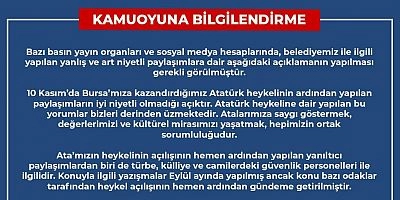 Yapılan açıklama şu şekilde; “10 Kasım’da Bursa’mıza kazandırdığımız Atatürk heykelinin ardından yapılan paylaşımların iyi niyetli olmadığı açıktır. Atatürk heykeline dair yapılan bu yorumlar bizleri derinden üzmektedir. Atalarımıza saygı göstermek, değerlerimizi ve kültürel mirasımızı yaşatmak, hepimizin ortak sorumluluğudur. Ata’mızın heykelinin açılışının hemen ardından yapılan yanıltıcı paylaşımlardan biri de türbe, külliye ve camilerdeki güvenlik personelleri ile ilgilidir. Konuyla ilgili yazışmalar Eylül ayında yapılmış ancak konu bazı odaklar tarafından heykel açılışının hemen ardından gündeme getirilmiştir. Cumhurbaşkanlığı Tasarruf Tedbirleri Genelgesi gereği kurumumuzca bir çok noktada yeniden değerlendirme yapılmış, bu alanlarda verimlilik ve tasarruf sağlanması için çalışmalara başlanmıştır. Yeni turizm stratejimiz kapsamında UNESCO Dünya Mirası Listesi’nde yer alan türbeler, külliyeler ve camilerde görev yapacak personeller bu hedefe uygun olarak görev alacaklardır. Önümüzdeki süreçte kentimizin tarihsel miraslarındaki çalışmalar, Bursa’mızın turizmine katkıda bulunacak donanımlı personeller tarafından sürdürülecektir. Kültürel miras alanlarımızda güvenlik zaafiyeti oluşturabilecek herhangi bir planlama söz konusu değildir. Kültür varlıklarımız ve ibadethanelerimize olan hassasiyetimiz doğrultusunda en iyi hizmeti sunma kararlılığımızı kamuoyuyla paylaşmak isteriz. Bu tür yorumları dile getiren kişileri de toplumsal birlik ve beraberliğe katkı sağlamaya davet ediyoruz. Kamuoyunun bilgisine saygıyla sunarız”.