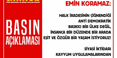 TMMOB olarak tarihimizin her döneminde antidemokratik ve baskıcı uygulamaların karşısında olduk. Bundan sonra da demokrasiden, özgürlüklerden, halkların kardeşliğinden ve barıştan yana tavrımızı sürdürmeye devam edeceğiz."