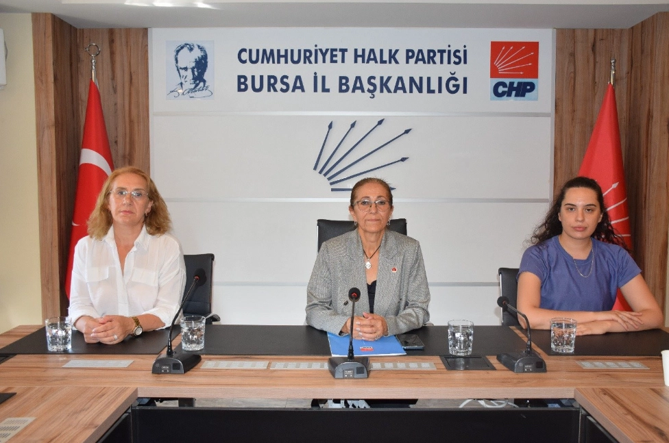 CHP Bursa İl Başkanlığı'nda kadın cinayetlerine dikkat çekmek amacıyla gerçekleştirilen basın açıklamasına Bursa İl Kadın Kolları Başkanı Nigar Bölüker, Kadın Kolları MYK Üyesi Fatma Özgür, İlçe Kadın Kolları Başkanları ve yöneticiler katıldı.