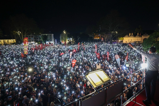 “Ve 19 Mart darbesinin faturası bu millete çıkıyor. Bakın bütün anketler gösteriyor ki; Türkiye’deki her dört kişiden birinin, toplumun sadece yüzde 25’ini, Tayyip Bey ve onun yargı aparatlarının yaptıklarını gece gündüz televizyonlarda anlatan bitiremeyenler toplumun sadece yüzde 25’ini ikna edebildiler. O dört kişiden birine; TRT’nin, A Haber’in, CNN’in ve diğerlerinin yalanlarına itibar eden o dört kişiden birine şunu söylemek isterim ki; bu operasyonun bedelini Ekrem İmamoğlu yatarak, eşi, çocukları onu bekleyerek ödüyorlar. Bizler siyaseten ödüyoruz. Ama emin olun ki sizler de Türkiye’deki 86 milyon bunun bedelini ödüyoruz. O günden bugüne hepimizin olan 57 milyar dolar, kişi başına bölününce AK Parti’ye, MHP’ye oy veren abimin de ablamın da cebinden 25 bin lira gitti. Bir asgari ücretten fazlası… O parayı Tayyip Bey’in Ekrem ağrıları için değil de örneğin atanmayan öğretmenler için… 1 milyon atanmayan öğretmen var. Var mı bu meydanda atanmayan öğretmen? Atanmayan öğretmenlere, eğer bu para harcansaydı 1 milyon 40 bin öğretmen atanıp 3 yıllık maaşı peşin yatabilirdi. Bu paranın 10’da birine en düşük emekli maaşı 30 bin lira yapılabilirdi. Bu paranın yarısıyla Türkiye’deki bütün çiftçilerin borcu kapanabilirdi. Öğrencilere gelince… Şu anda türkiye’de 1,7 milyon öğrenci, Kredi Yurtlar Kurumu kredisiyle ve bursla geçinmeye çalışıyor. Eğer bu para 1 milyon 700 bin öğrenci için harcanacak olsaydı, 4 yıl boyunca her ay 30 bin lira KYK’nın bursu karşılıksız verilebilirdi. Bu Kredi Yurtlar Kurumu, 2002’de AKP geldiğinde 45 lira kredi verirdi. Tayyip Bey, buna ‘45 liracık veriyorlar’ derdi. Bugün AK Parti, KYK kredisini 3 bin lira yaptı. Geldiğinde beğenmediği 45 lira, 4 gram altın alırken; bugün verdiği 3 bin lira, 0,75 gram altın alabilmektedir. Şu an içeride olan İstanbul Planlama Ajansı Başkanı’nın, İPA’nın yaptığı çalışmaya göre; İstanbul’da 20 yıl önce 10 gençten 3’ü geçim sıkıntısı çekerken, şimdi 5’i geçim sıkıntısı çekiyor. 10 gençten 8’i evlilik birikimi yapamıyor. 10 gençten 7’si ülkeyi terk etmenin hayalini kuruyor. 2005’te bir tiyatro bileti 2 lira, KYK kredisi 110 lirayken; o krediyle 55 kez tiyatroya gidilebiliyordu. Şimdiki 3 bin lirayla sadece 9 kez tiyatroya gidilebiliyor. 2005’in 110 lirası, 11 konsere götürürken; bugünün 3 bin lirası, 3 konsere götürebiliyor. Barınma krizi yaşayan, ekonomik özgürlüğü elinden alınan, şimdi vesayetin karanlığına gömülmek istenen, geleceği çalınan sizlerle birlikte bir büyük mücadeleyi vermeye, bu haksızlıklara son vermeye, eninden sonunda başarmaya ve kazanmaya kararlıyız.Bu geceyi Ekrem Başkan gibi Silivri zindanlarında geçiren gençleri, öğrencileri saygı ile selamlıyoruz. 44 arkadaşımız zindanlarda tutuluyor. Geçtiğimiz günlerde Bakırköy Kadın Cezaevi’nde ziyaret ettiğim Esila’ya bir kez de buradan selam olsun. Şöyle söylüyor Esila: ‘Her sabah Nazım’ın Bu Memleket Bizim şiirini okuyarak başlıyorum. Biliyorum ki her türlü zorluğa rağmen bu vatana bin güzellik mümkün. Adaletin en kısa sürede tecelli edeceğine olan inancımı koruyorum. Sizler gibi ben de tahliye gününü sabırsızlıkla bekliyorum.’ Hem Esila için, hem de 44 genç arkadaşımız için Beyazıt’tan hep birlikte haykırıyoruz: Gençlere özgürlük!”