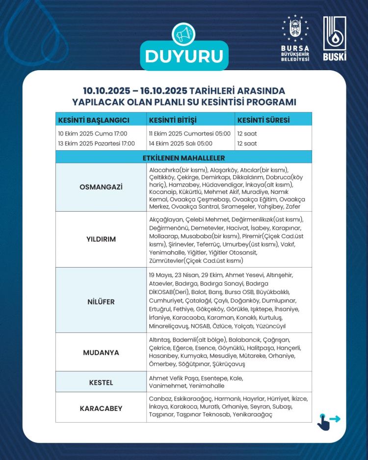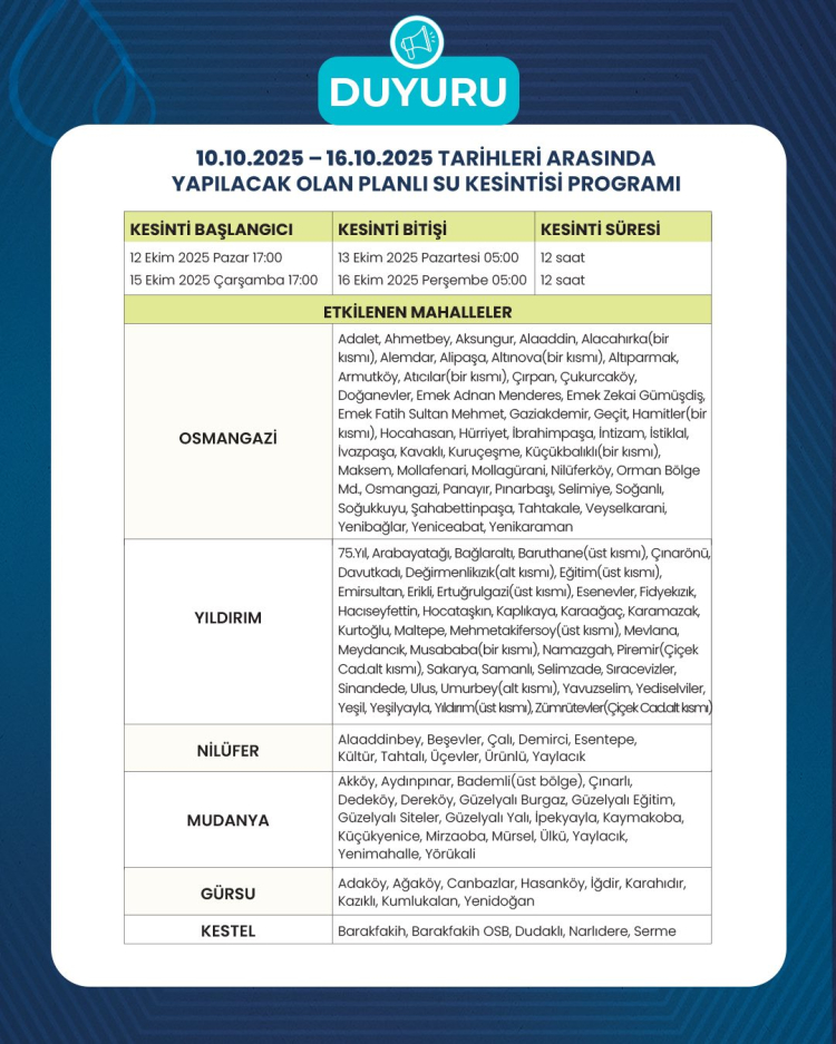 Belirtilen program dahilindeki su kesintileri, her günü en fazla 12 saati aşmayacak şekilde, merkez ilçelere bağlı mahallelerde sırayla gerçekleştirilecektir. Gerçekleştirilmesi planlanan bu su kesintileriyle birlikte günlük 100 bin metreküp su tasarrufu sağlanması amaçlanmaktadır. Planlanan su kesintilerinden Uludağ Üniversitesi, Şehir Hastanesi ve Devlet Hastaneleri muaf tutulacaktır.