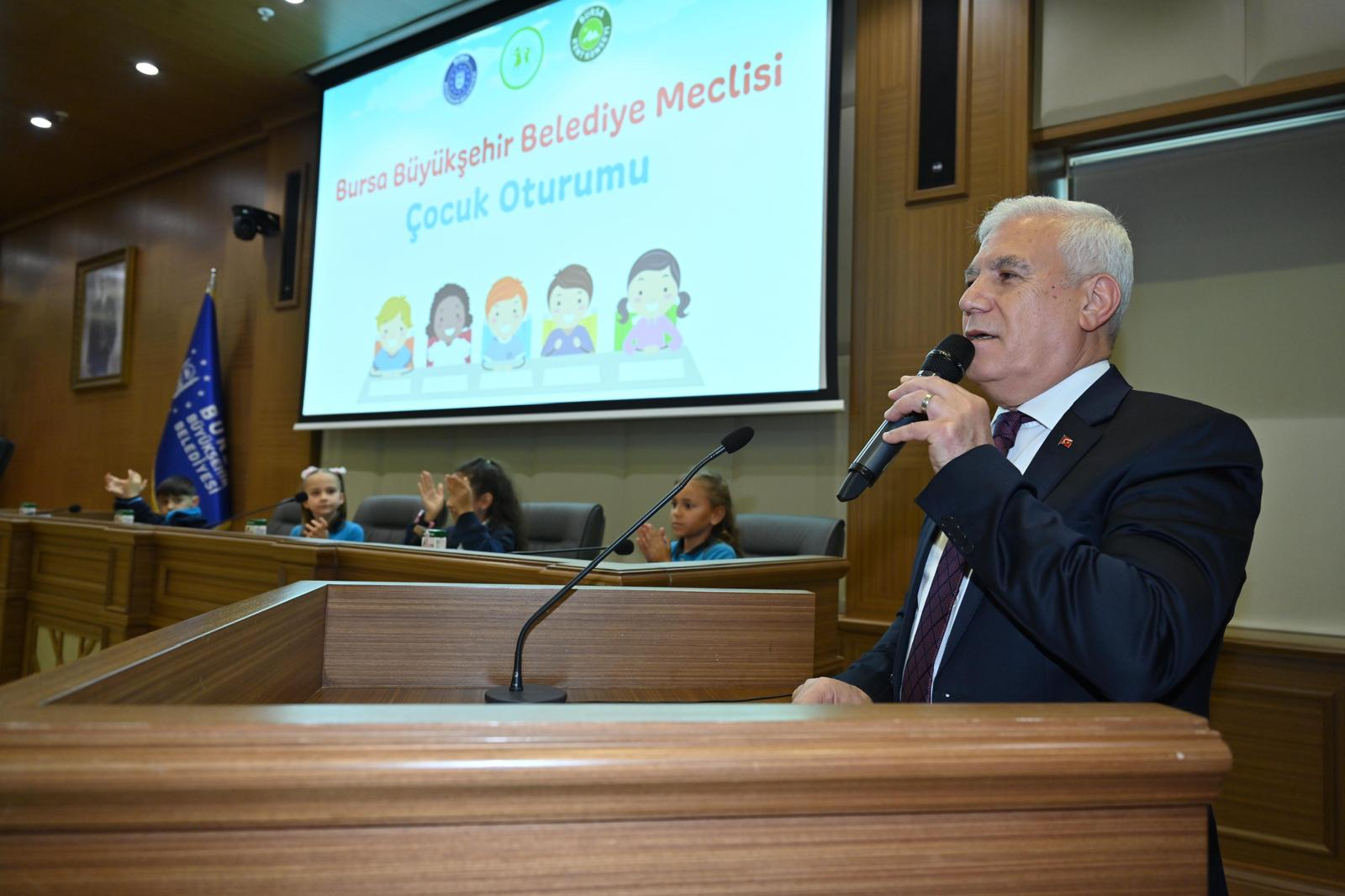 Bursa Kent Konseyi Çocuk Meclisi öncülüğünde 17 ilçeden gelen çocuklar, Büyükşehir Belediye Başkanı Mustafa Bozbey’in ve meclis üyelerinin koltuklarına oturarak Bursa’nın geleceğine ilişkin kararlar aldı. Başkan Bozbey, “Çocukların gözüyle dünyayı görmek ve daha güzel bir gelecek kurmak için hep birlikte çalışacağız” ifadelerini kullandı.