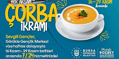 Bursa Büyükşehir Belediyesi tarafından yaptırılan ve açıldığı günden bu yana üniversiteli gençler tarafından yoğun olarak kullanılan Görükle Gençlik Merkezi’nde 24 saat hizmet uygulamasını yeniden başlatılıyor. Gençlik Merkezi, vize sınavları haftası olan 16-29 Kasım tarihleri arasında 24 saat kesintisiz hizmet verecek. Ayrıca öğrencilere her akşam saat 22.00’da sıcak çorba servisi yapılacak.