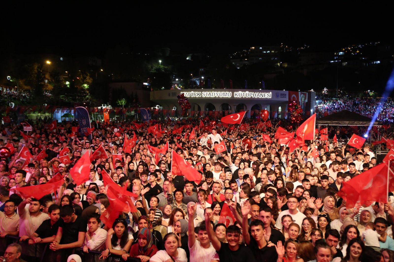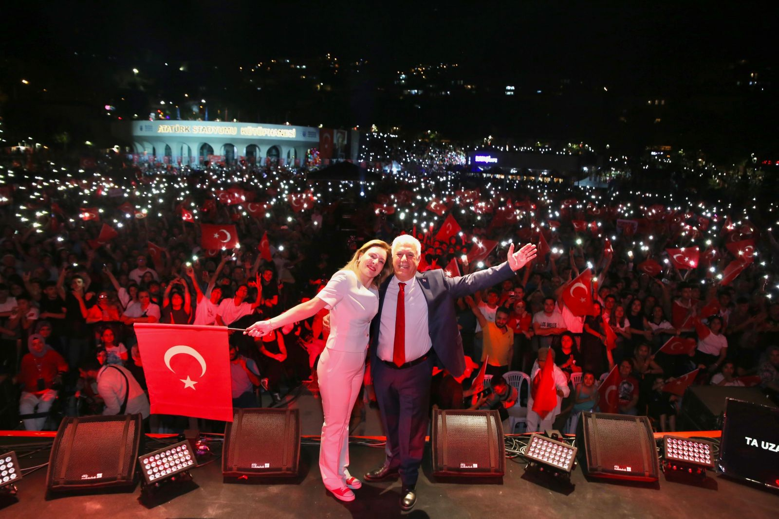 Konuşmanın ardından Başkan Bozbey, eşi Seden Bozbey ile alanı dolduran binlerce Bursalıyı Türk Bayrağı ile selamladı. Ardından usta sanatçı Nilüfer sahne alarak sevilen şarkılarını seslendirdi.