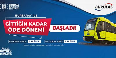 Büyükşehir Belediyesi iştiraklerinden BURULAŞ tarafından yapılan açıklamada, “17 Eylül 2024 Salı günü saat 00:00’dan itibaren ‘Gittiğin Kadar Öde’ uygulamasını hayata geçiriyoruz. Bu yeni sistemle birlikte toplu taşımada daha adil ve esnek bir ücretlendirme dönemine giriyoruz. Yolcularımız artık sadece kullandıkları mesafe kadar ödeme yapacak ve böylece toplu taşıma deneyimi daha ekonomik hale gelecek. BursaRay tam ücret tarifesi üzerinden 1-5 istasyon arası yolculuk yapan yolculara 5,00 TL, 6-11 istasyon arası yolculuk yapanlara ise 2,00 TL iade yapılacaktır. 12 istasyon ve üzeri yolculuklarda iade uygulanmayacaktır.