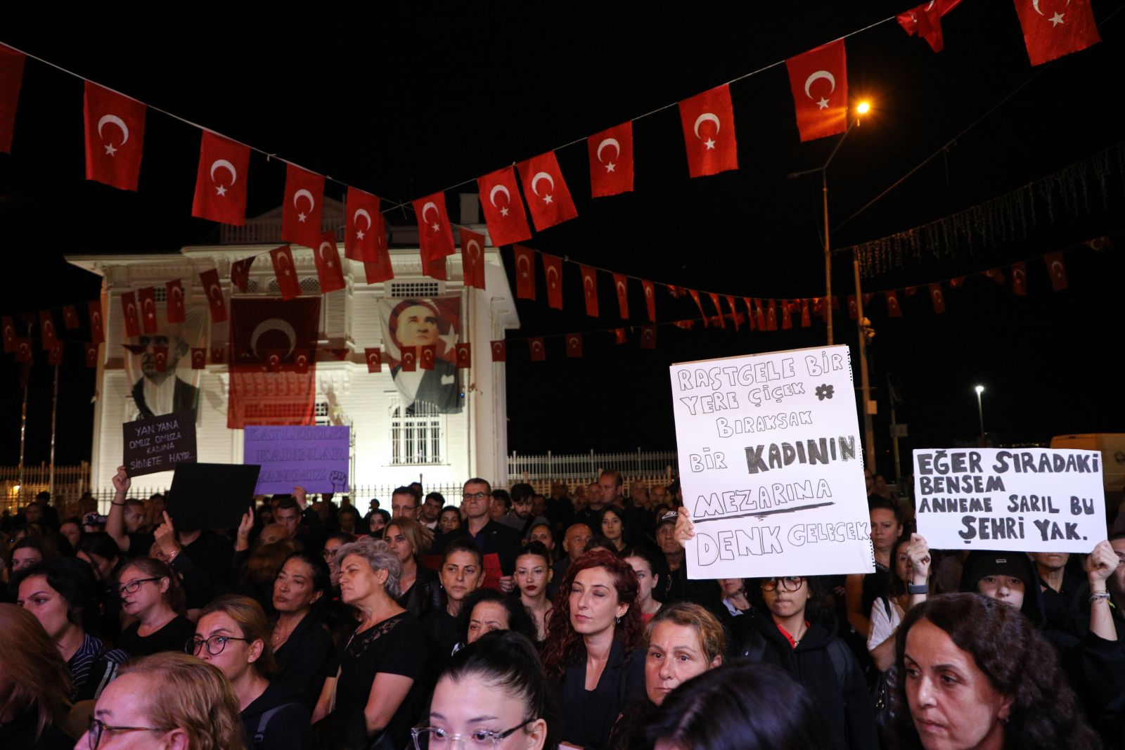 Mudanya Belediye Başkanı Deniz Dalgıç, yüz yıl öncesine göre kadına bakışın geriye gidiyor olmasından büyük üzüntü duyduğunu söyleyerek, sorunun çözümünde en önemli görevin erkeklere düştüğünü söyledi. Protestoya erkek katılımını yetersiz bulan Dalgıç, “Bu sorunların çözümünü kadınlara bırakamayız. Sorunun kaynağı olan biz erkekler çözümün en büyük parçası olmak zorundayız. Çünkü gücün bizde olduğunu düşündüğümüz için bu olayları yapan biziz. Bütün bunların ortadan kalkması için bizlere çok büyük görev düşüyor. Bu akşam burada siyahları giyerek çağrıya cevap verdik. Ancak bu katılımın daha fazla olması gerekirdi. Mustafa Kemal Atatürk toplumun her tarafında kadınları öncelerken böyle yapmamıştır. Bize verdiği ödev, bize verdiği görev bu değil. Aklımızı başımıza toplayalım.” dedi.
