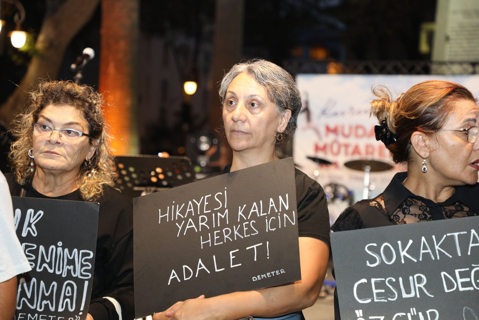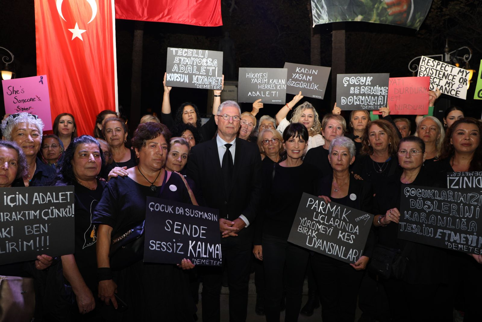 DEMETER Eşitlikçi Kadınlar Derneği Başkanı Nilgün Arslanoğlu, kadına yönelik şiddetin her geçen gün arttığını ve kadınların sürekli bir korku içinde yaşadıklarını belirtti. Arslanoğlu, “Biz kadınlar seyahat ederken, gece evimize dönerken, sabahın karanlığında işe giderken korkmak istemiyoruz. Yaşamak için korkmak istemiyoruz. Kadınların, çocukların katledilmemeleri için erkek şiddetine karşı sesimizi yükseltecek, özgür, eşit bir yaşam için mücadele etmeye devam edeceğiz. Yasaları uygulamayanlardan hesap soracağız” dedi. 6284 sayılı kanunun etkin bir şekilde uygulanması gerektiğini söyleyen Arslanoğlu, “Bu yasaya yönelik saldırılar, kadınların yaşam hakkını tartışmaya açmak demektir. Gelin, 6284'ü uygulatmak için ses olalım ve kadın cinayetlerini durduralım” çağrısında bulundu.
