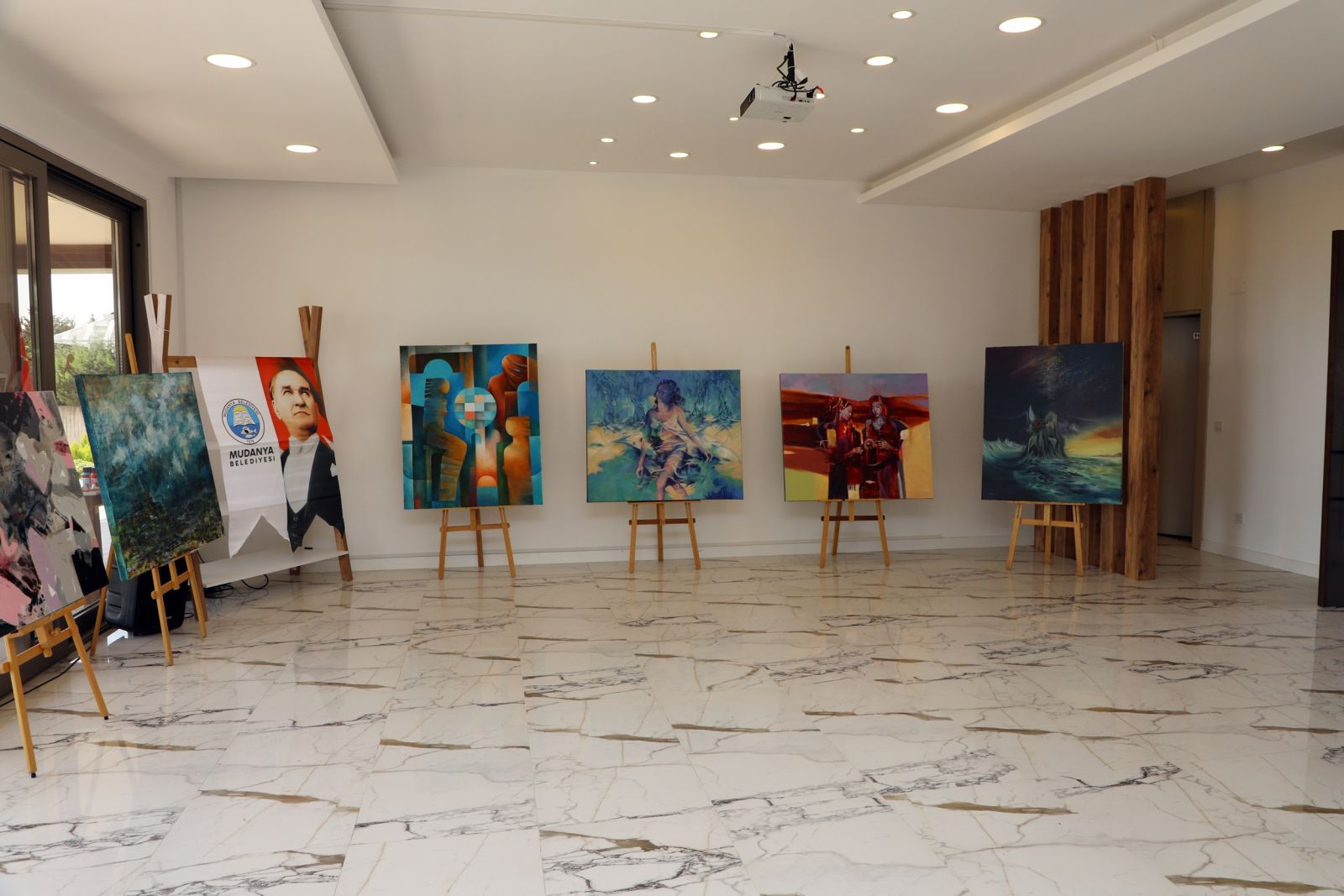 Mudanya Belediyesi’nin Cumhuriyetin 100. Yılına özel olarak düzenlediği “Sanatın Işığı” isimli resim çalıştayında bir araya gelen 16 ressamın eserleri düzenlenen sergiyle izlenime sunuldu.