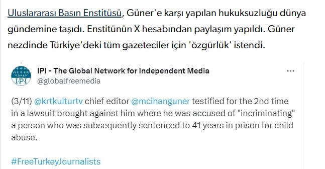 Uluslararası Basın Enstitüsü, Güner'e karşı yapılan hukuksuzluğu dünya gündemine taşıdı. Enstitünün X hesabından paylaşım yapıldı. Güner nezdinde Türkiye'deki tüm gazeteciler için 'özgürlük' istendi.