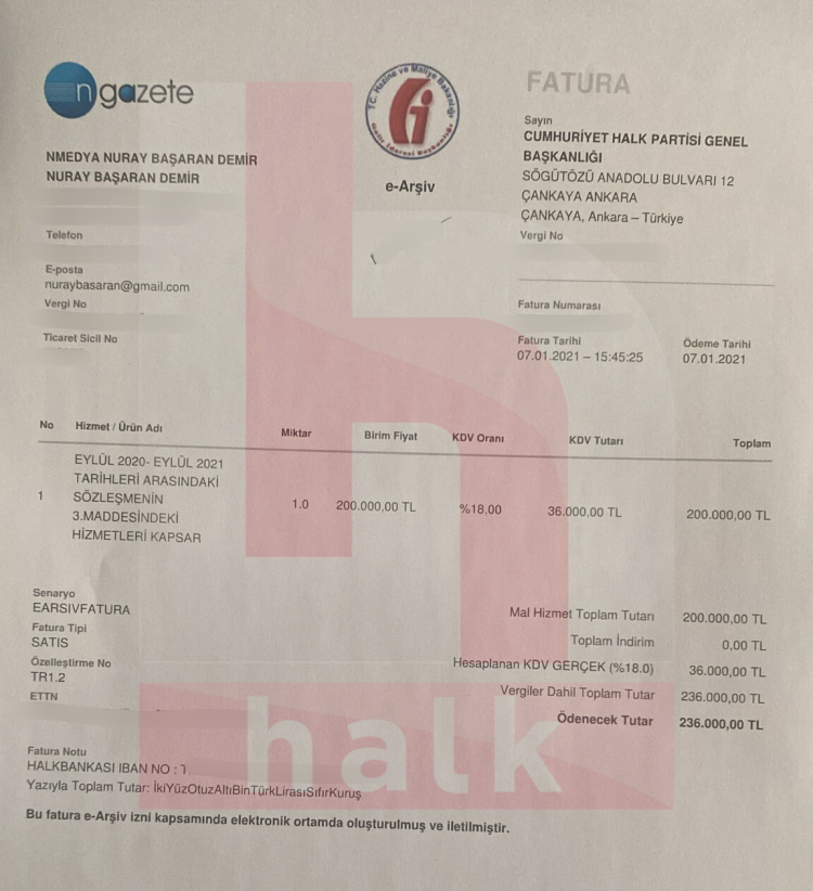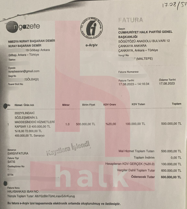 Başaran’ın şirketine yapılan en dikkat çekici ödeme ise 14 Mayıs 2023 seçimlerinin ardından gerçekleşti. CHP’nin kurultay kararı aldığı bu dönemde, 17 Ağustos 2023 tarihli fatura karşılığında şirkete 600.000 TL ödeme yapıldı. Fatura açıklamasında bu tutarın, bir “senaryo çalışması” sözleşmesi kapsamında ödendiği bilgisi yer aldı.