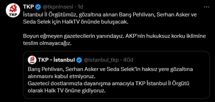 Halk TV'ye yapılan operasyonun ardından CHP, Halk TV binası önünde toplanma çağrısı yaptı. CHP'nin ardından TKP ve TİP de aynı çağrıyı bulundu.