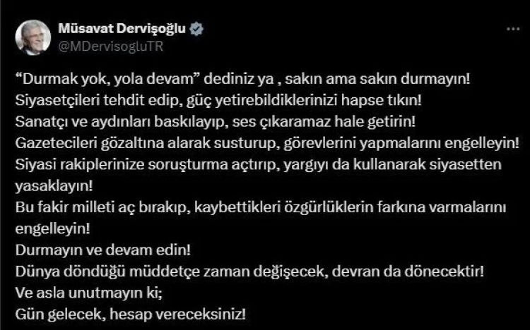 “Durmak yok, yola devam” dediniz ya , sakın ama sakın durmayın! Siyasetçileri tehdit edip, güç yetirebildiklerinizi hapse tıkın! Sanatçı ve aydınları baskılayıp, ses çıkaramaz hale getirin! Gazetecileri gözaltına alarak susturup, görevlerini yapmalarını engelleyin! Siyasi rakiplerinize soruşturma açtırıp, yargıyı da kullanarak siyasetten yasaklayın! Bu fakir milleti aç bırakıp, kaybettikleri özgürlüklerin farkına varmalarını engelleyin! Durmayın ve devam edin! Dünya döndüğü müddetçe zaman değişecek, devran da dönecektir! Ve asla unutmayın ki; Gün gelecek, hesap vereceksiniz!"